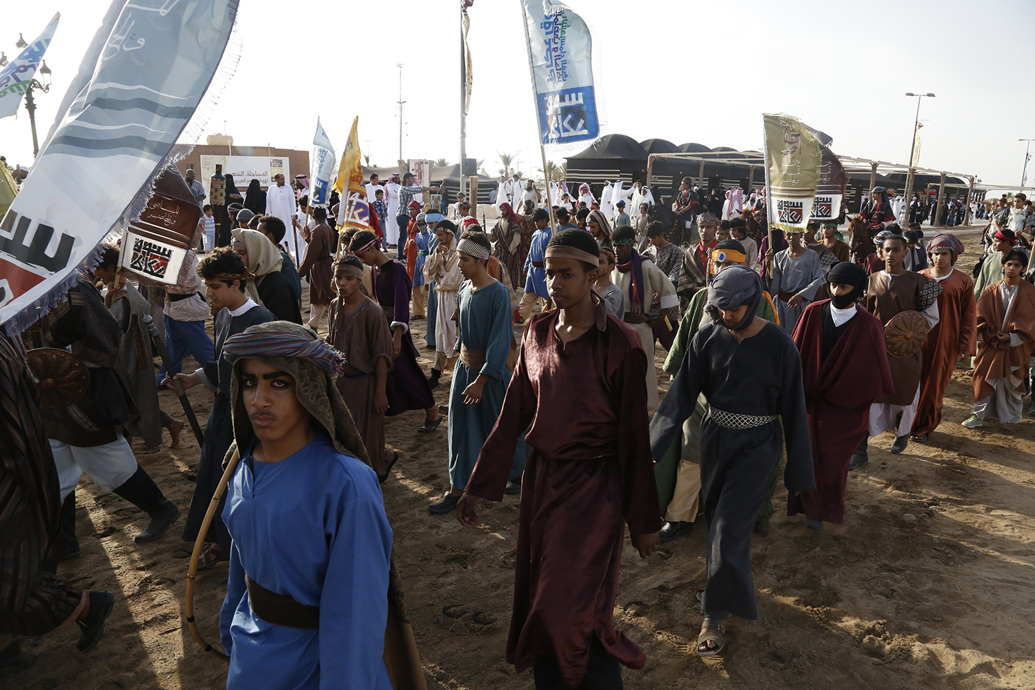 تبدأ المسيرة من بداية الجادة إلى نهايتها والممثلون يلبسون الزي الخاص بالعمل ويحملون الدروع والسيوف والرماح، وتسير خلفهم الجمال والخيول، مع موسيقى تعطي إيحاء الماضي في ميدان الجادة، بينما يقف على بعد خطوات منهم الجمهور وزوار الجادة يشاهدون كيف كانت حياة القبائل في الجزيرة العربية في تلك الحقبة التي تسبق ظهور الإسلام.. لتجسد الفعالية التقاء عصرين بينهما أكثر من 1500 عام، عصر يجسد، وعصر يشاهد مسرح الشارع.