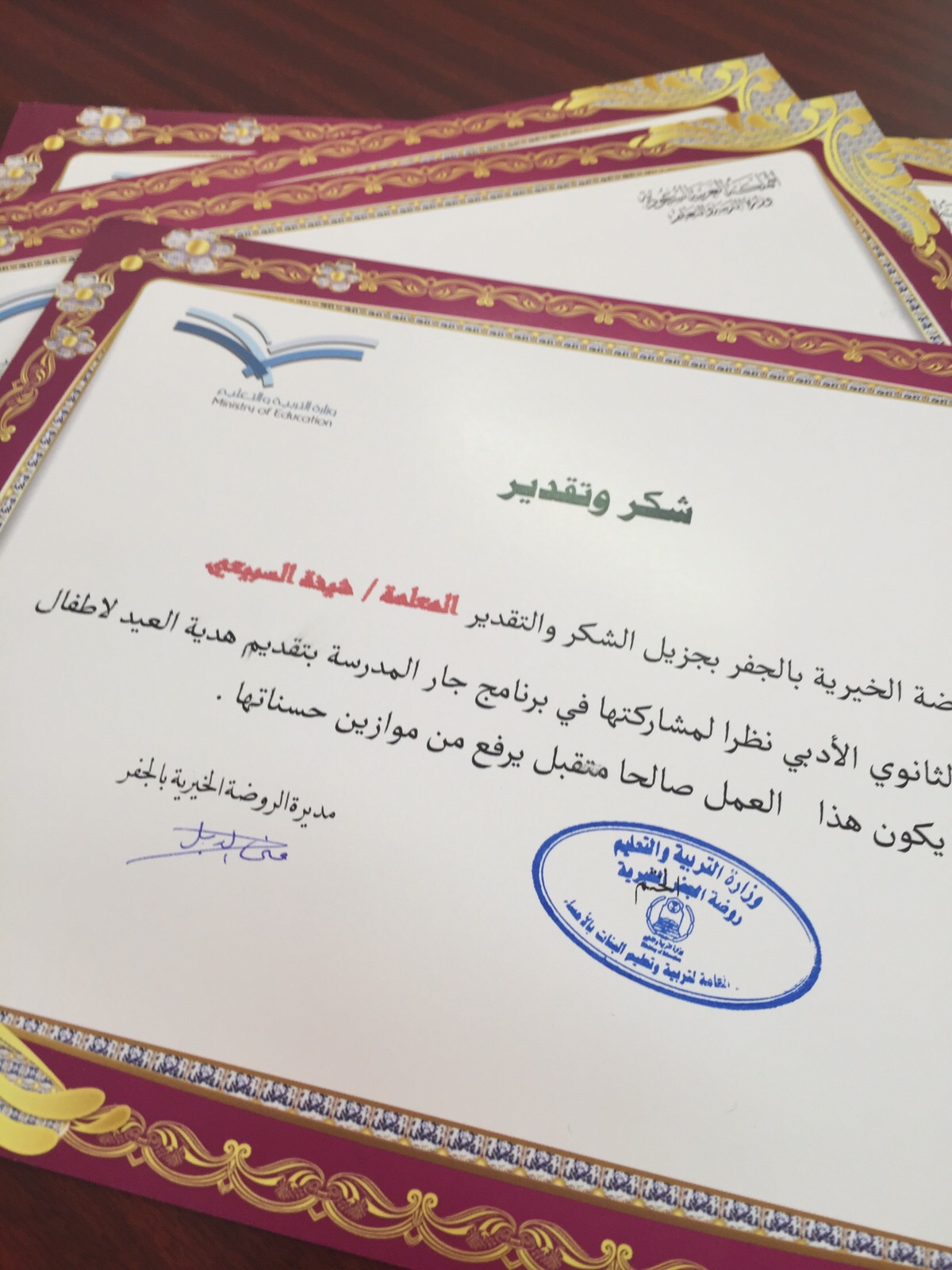بروح أخوية ودية تسير على هديٍ نبويٍ يدعو إلى الإحسان بدأت ثانوية الجفر الأولى بتنفيذ برنامج ( جار المدرسة ) كأحد برامج خطتها التشغيلية والذي يستهدف إيجاد بصمة إيجابية على المجتمع تحقيقاً للشراكة المجتمعية وشداً لروابط وعرى الإخاء بين فئاته مستهدفات به روضة الجفر الخيرية حيث قدمت الطالبات هدايا العيد للأطفال مُدخلات الفرح والسرور عليهن كما أشادت مديرة الروضة أ / منى الدبل بمبادرتهن الطيبة مُحررةً شهادات شكر لقائدة الصف الثالث الأدبي أ / شيخة السبيعي و طالباتها الكريمات