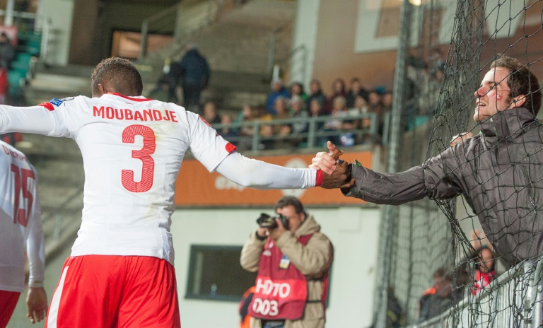 المدافع السويسري فرنسوا موباندجي مصافحا احد المشجعين بعد انتهاء المباراة امام استونيا ضمن تصفيات كاس امم اوروبا