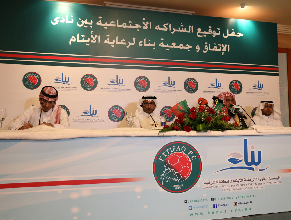 وقعت نادي الاتفاق والجمعية الخيرية لرعاية الأيتام بالمنطقة الشرقية (بناء) عقد الشراكة بين الطرفين، وذلك في مؤتمر صحفي شهد حضور الأمير نواف بن محمد رئيس الاتحاد السعودي لألعاب القوى وعدد من رجال الأعمال في المنطقة الشرقية ونجوم الفريق في عصره الذهبي.
