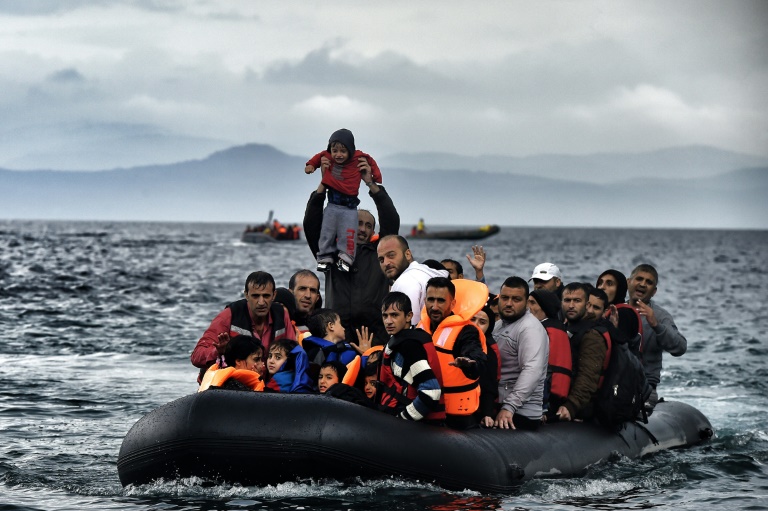 قارب مهاجرين عند وصوله الى جزيرة ليسبوس اليونانية قادما من تركيا.