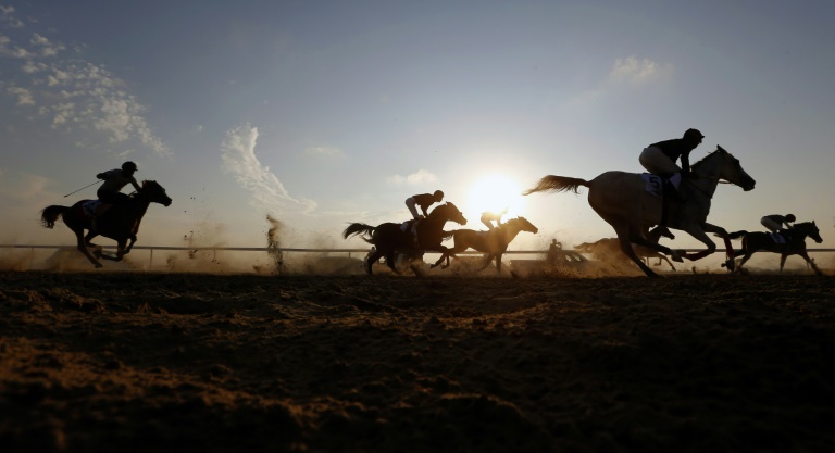 سباق خيول عربية على هامش مهرجان مزاينة الظفرة للابل في في الصحراء قرب مدينة زايد بالامارات