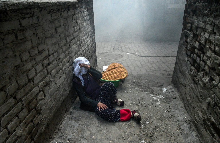 امراة تغطي وجهها بينما تستخدم الشرطة التركية الغاز المسيل للدموع خلال مواجهات في دياربكر