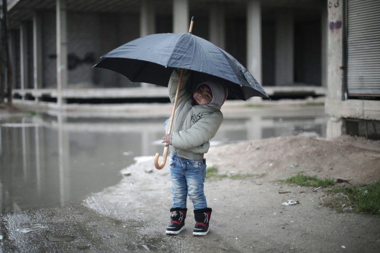 طفل سوري يحمل مظلة في كفر بطنا في الغوطة الشرقية الواقعة تحت سيطرة مقاتلي المعارضة
