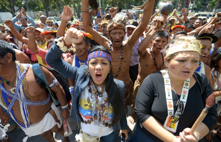 سكان اصليون او امازونيون في فنزويلا يتظاهرون بعد الغاء نيابة ثلاثة ممثلين عنهم في البرلمان.