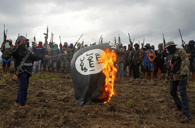 مسلحون من منظمة بولاهان او حماة الله الفيليبينية يحرقون علم تنظيم الدولة الاسلامية في جبال مينداناو.