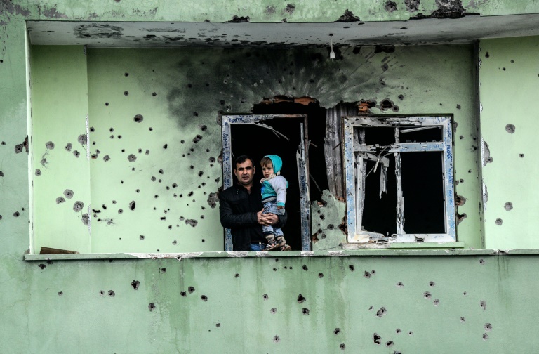 رجل يحمل رضيعا ويقف على شرفة منزل اصيبت واجهته بشظايا بعد رفع حظر التجول في سيلوبي بجنوب شرق تركيا