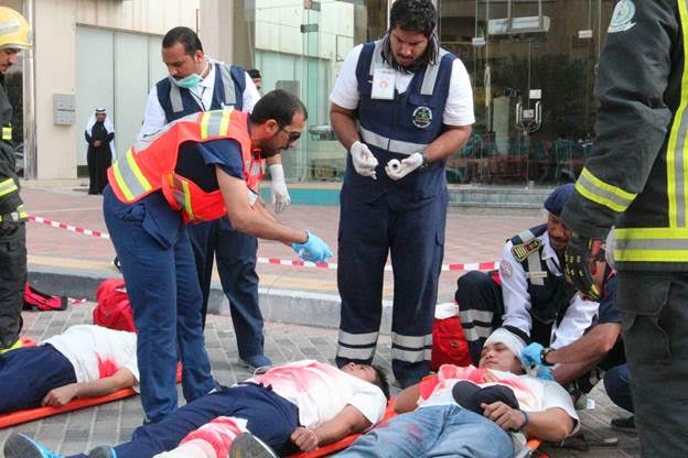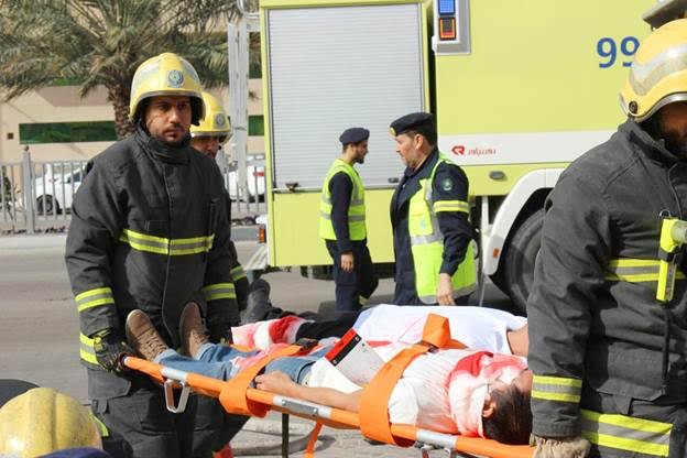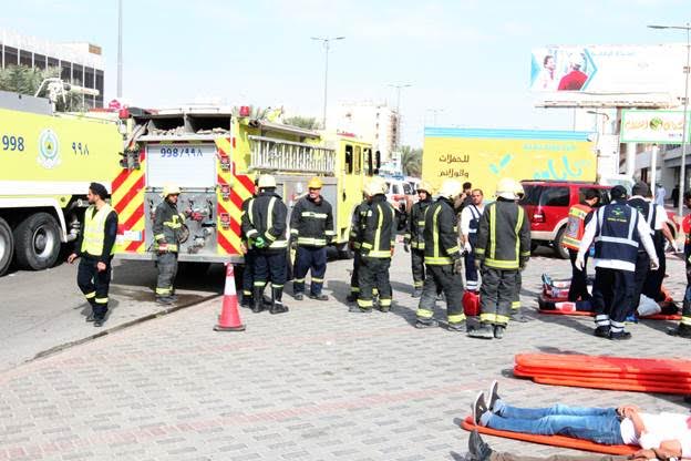 حيث بداء السيناريو ببلاغ من مركز القيادة بالدفاع المدني وتوجهت فرق المساندة الى موقع الحادث وتم فرز الحالات وإرسال المصابين لقسم الطوارىء بالمستشفى .