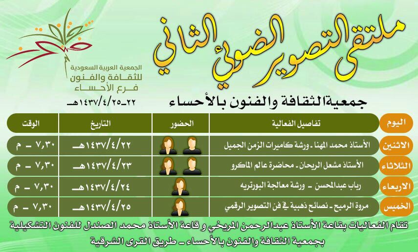 تستعد لجنة التصوير الضوئي بجمعية الثقافة والفنون بالأحساء على إقامة ملتقى التصوير الضوئي الثاني والذي يحوي العديد من الفعاليات والبرامج المختلفة والتي تستهدف الفنانين الفوتوغرافيين من كلا الجنسين و ذلك لمدة أربع أيام متوالية من يوم الأثنين القادم ٢٢ / ٤ / ١٤٣٧ وإلى غاية يوم الخميس ٢٥ / ٤ / ١٤٣٧ وفي الفترة المسائية ، وحول الملتقى صرح الأستاذ خالد البدنه مشرف لجنة التصوير الضوئي بالجمعية بأن تنوع الفعاليات والأنشطة هدف من أهداف القسم ونهدف من ذلك إلى إكساب العديد من المهارات التي تساعد الفنان الفوتوغرافي وتسهم في تجدد إبداعه بشكل يشمل جميع الفئات الهاوية والمبتدئة والمحترفين وهذا ما عملنا على تحقيقه من خلال هذا الملتقى والذي سوف نقدم من خلاله وعلى مدى ٤ أيام مجموعة من المحاضرات والورش الفنية في التصوير ومنها : ورشة كاميرات الزمن الجميل للأستاذ محمد المهنا و محاضرة عالم الماكرو للأستاذ مشعل الريحان و ورشة معالجة البورتريه للأستاذة رباب عبدالمحسن و نصائح ذهبية في فن التصوير الرقمي للأستاذة مروه الرميح ، وقد وجه البدنه كل الشكر والتقدير لجميع من أسهم في تنفيذ الأنشطة أو أي فعالية فوتوغرافية وخص بالشكر جميع المحاضرين والمحاضرات الذين سيقدمون ما لديهم من خبرات في هذا الملتقى الفوتوغرافي المهم .