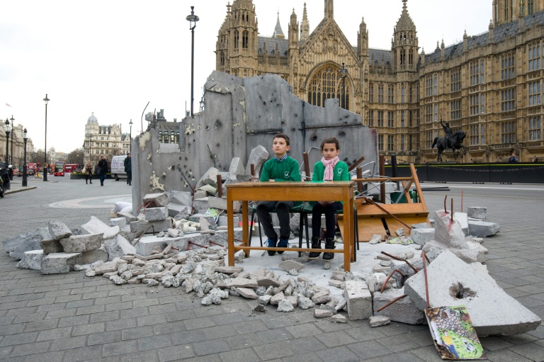 تلميذان دمرت مدرستهما في حلب يحلسان داخل مجسم يمثل المدرسة اقامته منظمة انقذوا الاطفال الخيرية امام البرلمان البريطاني قبل انعقاد مؤتمر لجمع التبرعات للسوريين.
