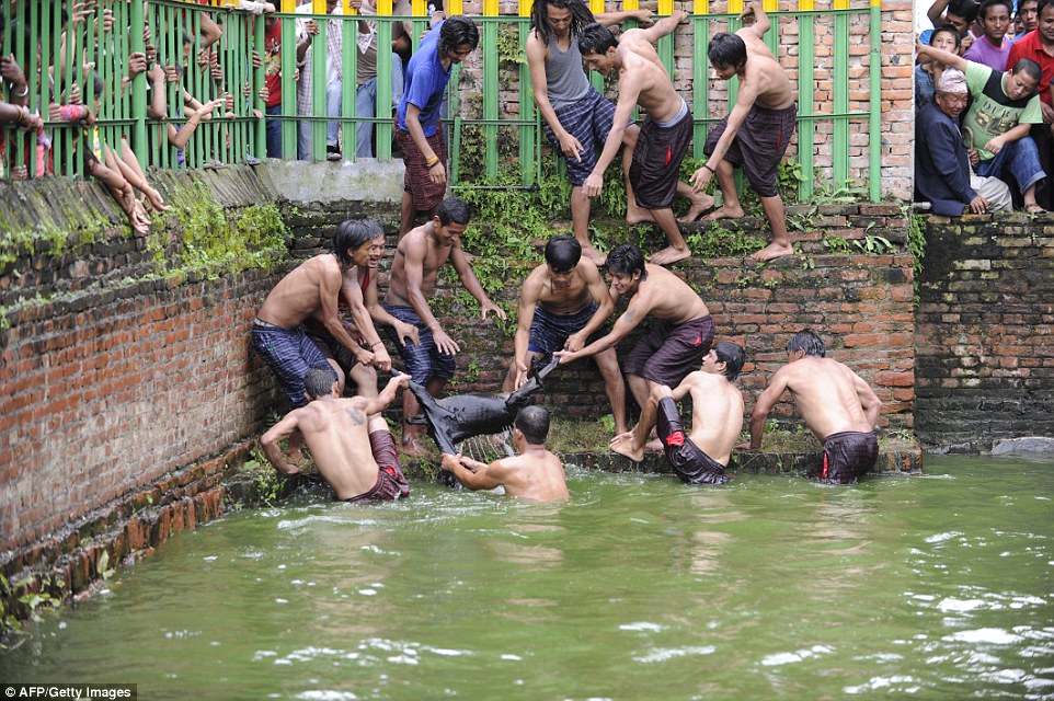 وبحسب صحيفة ديلي ميل البريطانية، فقد التقطت هذه الصور خلال السنة الجارية، ويطلق عليه اسم مهرجان Deopokhari تعيش فيه الماعز لحظات مروعة من التعذيب، ويقام المهرجان منذ 900 عام في شهر أغسطس من كل عام في قرية خوكانا في النيبال.