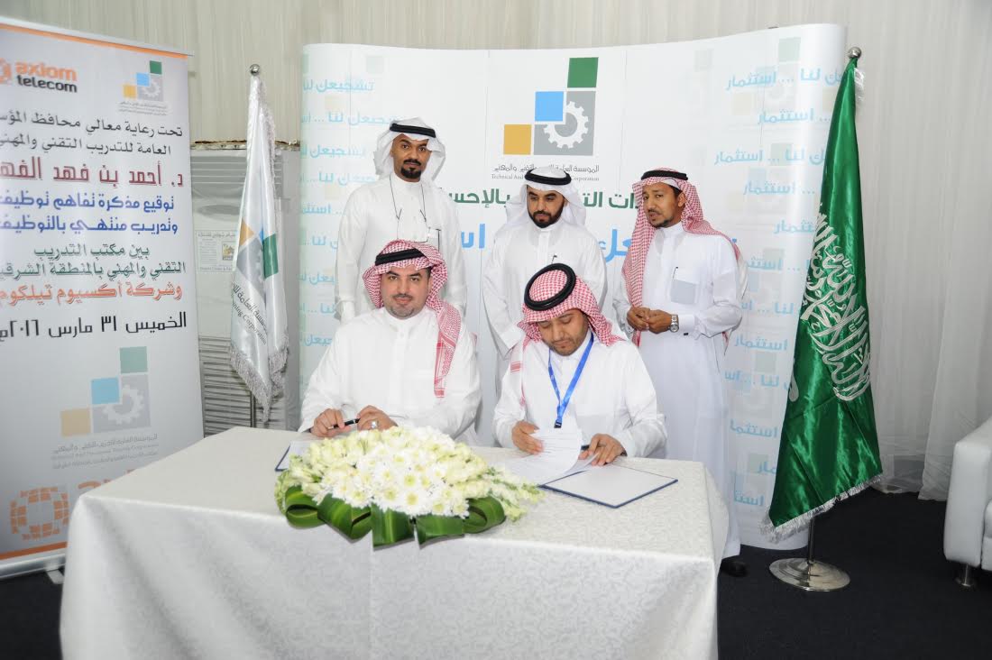 اتفقت المؤسسة العام للتدريب التقني و المهني مع شركة اكسيوم تليكوم السعودية على تنفيذ برنامج تدريبٍ منتهٍ بالتوظيف لحوالي (400) شاب سعودي ,في مختلف مناطق المملكة التي تتوافر فيها فروع الشركة في مجالي (الإلكترونيات و صيانة الجوالات و التسويق و المبيعات) ,وذلك في إطار مواكبة الشركات العاملة بقطاع الاتصالات بالمملكة لتطبيق قرار وزارة العمل بقصر التوظيف ببيع الجوالات وصيانتها على السعوديين و السعوديات.ووقع الاتفاقية الخاصة بالبرنامج من جانب المؤسسة رئيس مكتب التدريب التقني والمهني بالمنطقة الشرقية أحمد بن عبدالكريم الثنيان ، ومن جانب شركة أكسيوم تليكوم مدير عام الشركة بالسعودية جمال الهويملي البقمي وبحضور محافظ المؤسسة دكتور أحمد بن فهد الفهيد و مدير عام الموارد البشرية للشركة محمد الجوهر الطائفي.واتفق الجانبان على إقامة برامج مشتركة بين الطرفين لتأهيل وتخريج فنيين سعوديين في مجالات صيانة الجوالات والإلكترونيات وبيعها ,والعمل على استقطاب الشباب السعودي للالتحاق في برنامج التدريب المنتهي بالتوظيف ,بغرض تأهيل الكوادر الوطنية لسد احتياج فرص العمل الموجودة بالسوق السعودي في هذا القطاع الجديد,خاصة أن عدد الجوالات التي يتم صيانتها سنوياً لدى الشركة (200) ألف جوال.و يشترط للالتحاق بالبرنامج بحسب الاتفاقية أن يكون المتقدم سعودي الجنسية، وأن لا يقل عمره عن (18) عاماً ، وأن لا يكون موظفاً في القطاع العام أو الخاص، وأن لا يكون قد استفاد من برامج التدريب المحددة في هذه الاتفاقية..ووفقاً للاتفاقية ستتولى المؤسسة العامة للتدريب التقني والمهني بتوفير مقار التدريب المناسبة (قاعات، معامل، ورش تدريبية) ، وتمكين المتدربين الملتحقين بالبرنامج من الاستفادة من المرافق الخدمية المتاحة في أماكن التدريب ومنح المتدربين شهادات إكمال البرنامج. في حين تلتزم شركة أكسيوم تليكوم السعودية بجانب التسويق للبرنامج والوظائف المتاحة حيث يتمكن المتقدم من التعرف على البرنامج، واستقطاب واجراء المقابلات وتوفير الفرص الوظيفية للمتقدمين ،وتوفير الزي الرسمي والتأمين الطبي وصرف المكافآت التشجيعية للمتدربين في البرنامج.يشار إلى أن المؤسسة العامة للتدريب التقني دخلت مؤخراً في شراكات مع كبرى شركات صناعة أجهزة الجوال (سامسونج ,هواوي)بهدف توفير برامج تدريبية متخصصة للسعوديين والسعوديات في مجال صيانة وبيع أجهزة الجوال .