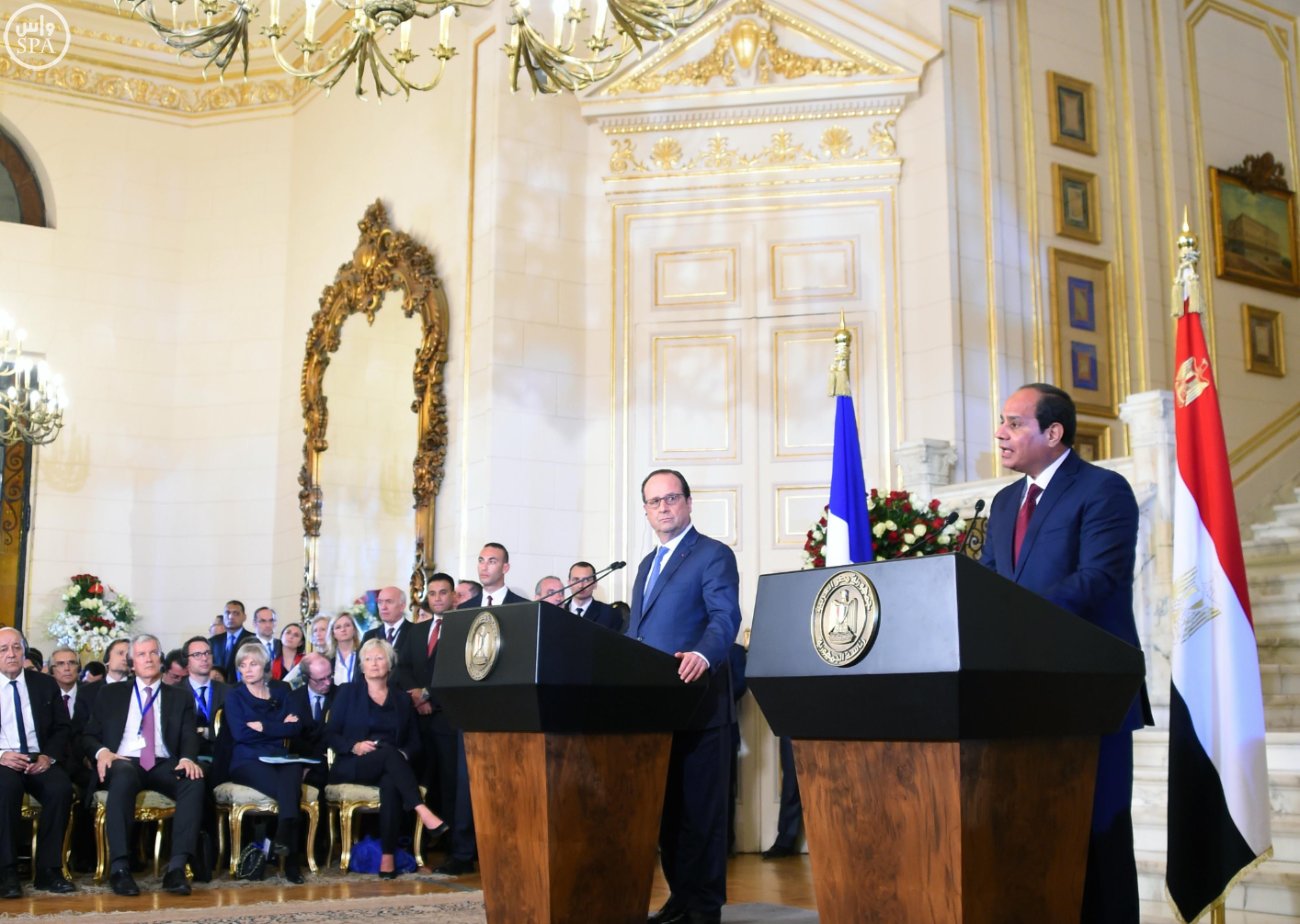 أكد الرئيس المصري عبد الفتاح السيسي أن العلاقات الثنائية بين القاهرة وباريس تشهد تناميًا ملحوظًا على جميع الأصعدة، مشيرا إلى أن زيارة الرئيس الفرنسي في هذا التوقيت تؤكد مجددًا التطور الذي تشهده العلاقات بين البلدين.وقال الرئيس السيسي في كلمته خلال المؤتمر الصحفي الذي عقده مع نظيره الفرنسي فرانسوا أولاند الذي يزور مصر حاليًا، إن المباحثات استعرضت مختلف جوانب العلاقات الثنائية، حيث تم إعادة التأكيد على التمسك بثوابت العلاقات الوطيدة القائمة بين مصر وفرنسا وعلى استمرار تبادل اللقاءات رفيعة المستوى، ومواصلة التشاور بشكل متعمق بشأن العلاقات الثنائية والقضايا الدولية والإقليمية ذات الاهتمام المشترك واستمرار التعاون بين البلدين في مختلف المحافل الإقليمية والدولية.وأوضح أنه تم الاتفاق على تنشيط حركة التبادل التجاري بين البلدين، واستعراض الفرص الواعدة المتاحة للاستثمار في مصر، والتأكيد على مواجهة التهديدات الإرهابية التي أصبحت تستهدف الجميع، لافتًا الانتباه إلى أنه تم بحث الجهود المشتركة لتسوية الأزمات في المنطقة وفي مقدمتها جهود إحياء المفاوضات بين الفلسطينيين والإسرائيليين وصولاً إلى تنفيذ حل الدولتين، وضرورة ضمان وحدة وسيادة واستقرار الأراضي الليبية، وتنسيق الجهود للتوصل إلى حل سياسي في سوريا يحافظ على كيان الدولة ووحدة واستقرار أراضيها وينهي معاناة الشعب السوري المستمرة منذ ست سنوات.وأضاف: إنه فيما يتعلق باهتمام فرنسا وأوروبا بملف حقوق الإنسان والحريات في مصر، فإنه يؤكد للجميع حرص الدولة المصرية على أن يكون هناك مفهوم أوسع وأعمق للحريات وحقوق الإنسان في مصر.وأشار إلى أن المباحثات تناولت عودة السياحة إلى مصر، مؤكدًا استعداد مصر لاستقبال المزيد من الأصدقاء الأوروبيين مع توفير الأمن والاستقرار اللازم سواء عند تواجدهم في المطارات أو الأماكن السياحية.وقال الرئيس الفرنسي من جانبه إنه تم استعراض تعزيز العلاقات الثنائية بين مصر وفرنسا خلال لقائه الرئيس المصري، مشيرًا إلى أنه بحث تعزيز التعاون في المجال السياسي والاقتصادي والثقافي.وأوضح أنه تم مناقشة الأوضاع الإقليمية والمبادرات التي سيتم إطلاقها للإسهام في تحقيق الاستقرار والسلام في المنطقة.وفيما يتعلق بالأزمة الليبية, أكد أن بلاده سوف تعمل مع مصر لكي تتخلص مع المجتمع الدولي مما حصل من فوضى في ليبيا.وبشأن مستقبل سوريا، قال إنه يمكن أن يتم التوجه إلى الحل خطوة خطوة ومرحلة تلو الأخرى شرط أن تجد المعارضة مكانها وأن يتم احترام الهدنة وأن يكون للدول المجاورة أو الدول الأجنبية الضغوط المناسبة لتستعيد سوريا الاستقرار والأمن والسلم وأن تنتهي من المجازر والقمع والإرهاب.وأشار إلى أنه تم الحديث عن الأوضاع في اليمن، والمبادرة الفرنسية لحل النزاع الفلسطيني الإسرائيلي، مؤكدا أن الوضع في الشرق الأوسط خطير والإرهاب خطورته عميقة ولابد من مكافحته بحزم.