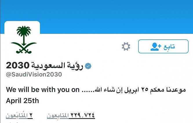 يذكر أن عدد متابعين الرؤية السعودية 2030 تجاوز 200 ألف متابع في ثلاث أيام من تدشينها على موقع التواصل الاجتماعي تويتر والعدد قابل للزيادة خلال الساعات القادمة .