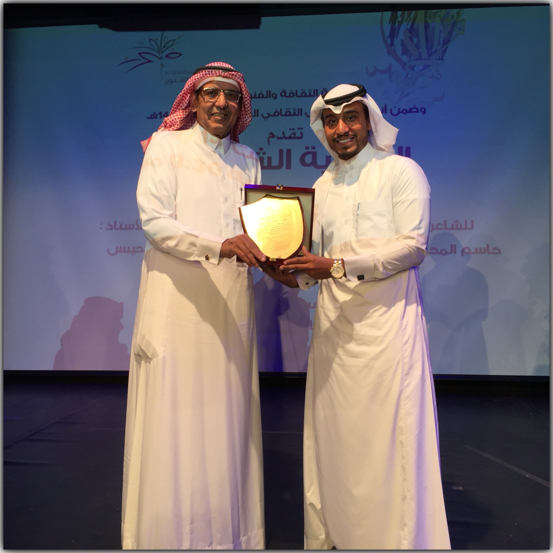 ضمن الأمسيات الثقافية الرمضانية والتي يقدمها المقهى الثقافي بجمعية الثقافة والفنون بالأحساء والتي إحتفت بالشعر يوم الأمس السبت على مسرح المريخي بالجمعية و من خلال الشاعر جاسم المحيبس والذي قدمه إبنه الأستاذ بكر المحيبس حيث تناول بعض المحطات المهمة في حياة والده وتعلقه بالشعر منذ الصغر ودفعه لذلك شغفه وحبه للغة العربية ، بعد ذلك