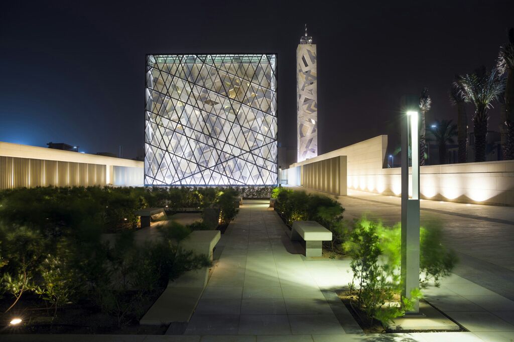 ويتغير شكل المسجد نهارًا عنه في الليل، مع نمط النوافذ المتوهجة والمحاطة بالزجاج الملون، بحيث تنعكس الظلال نهارًا، وهو ما يخلق تجربة ديناميكية تختلف حسب الموسم المناخي، وفي الليل، يبدو الصندوق الزجاجي الذي يتوسط المسجد مثل المصباح، يتلألأ مع الضوء في الأسفل، وتتخلله نقاط الضوء من أعلى، ومن الداخل هناك تفاعل بين الظل والظلال، وترى من خلالها تحولًا تكنولوجيًا للجدار التقليدي من “المشربيات”.
