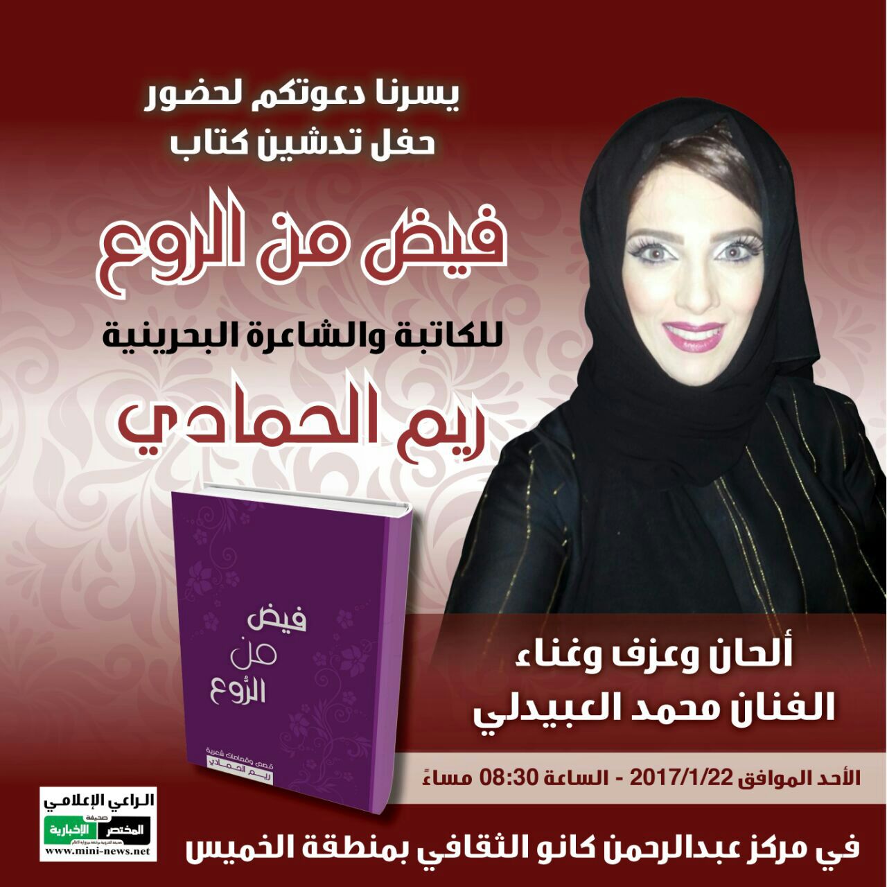 المختصر راعي اعلامي البحرينية ريم الحمادي تدشن كتابها “فيض من الروع ” الليلة