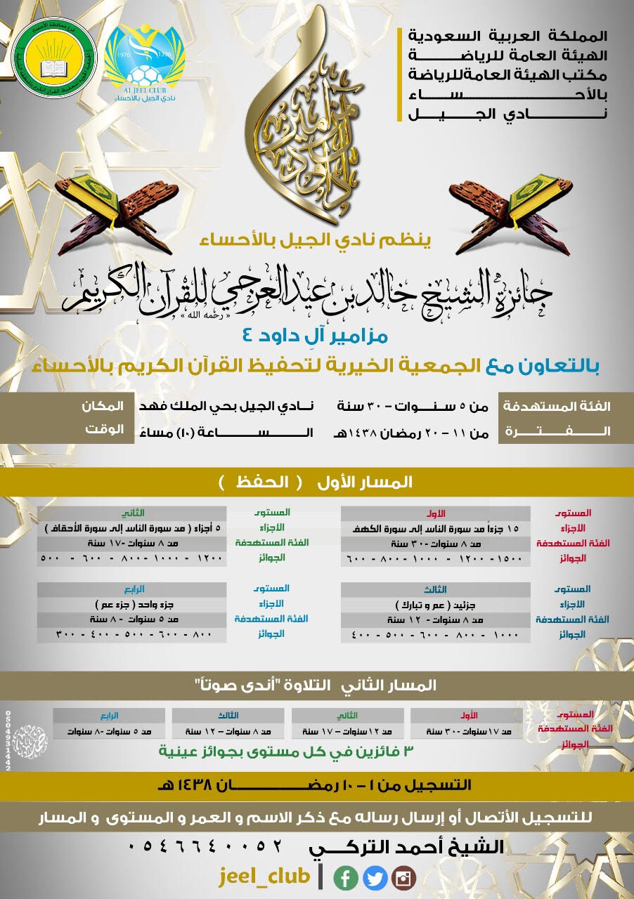 أعلن نادي الجيل بالأحساء متمثلاً في اللجنة الثقافية والاجتماعية عن بدء التسجيل في جائزة الشيخ خالد بن عيد العرجي “رحمه الله” للقرآن الكريم “مزامير آل داود4” بالتعاون مع الجمعية الخيرية لتحفيظ القرآن الكريم بالأحساء ، ويستمر التسجيل حتى العاشر من هذا الشهر الكريم على أن تنطلق فعاليات المسابقة خلال الفترة من 11-20 رمضان 1438هـ عقب صلاة التراويح مباشرة في مقر النادي بحي الملك فهد.