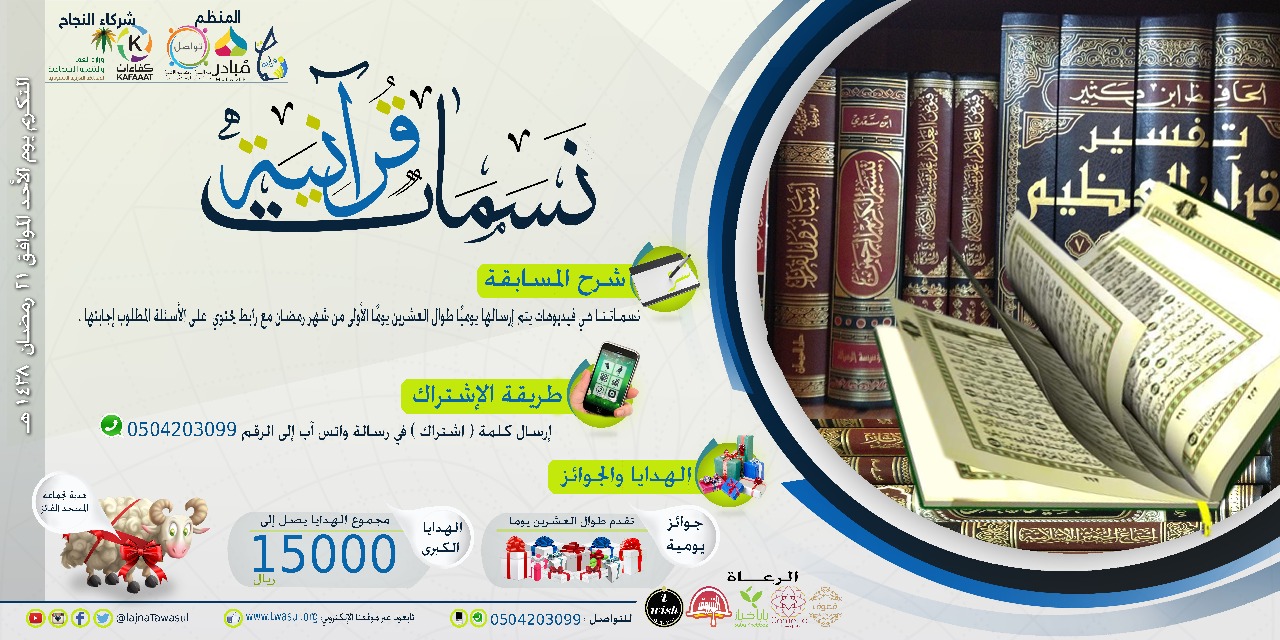 – جوائز كبرى في نهاية الشهر الكريم يبلغ مجموعها 15,000 ريال ستقدم لأفضل 5 أشخاص كان أدائهم متميزاً خلال العشرين يوماً.
