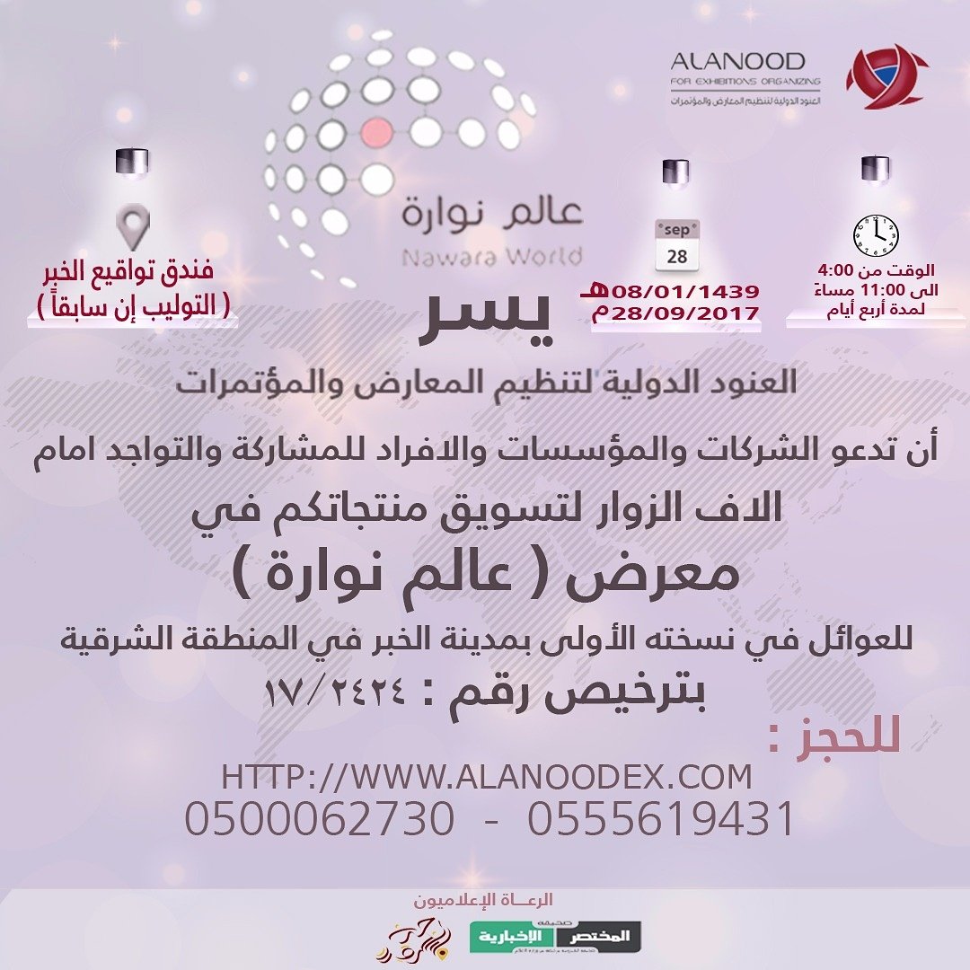اعلنت العنود الدولية لتنظيم المعارض والمؤتمرات عن اقامة معرضها الموسوم بـ (عالم نوارة) الذي سيتم اطلاقة في الخبر مطلع العام الهجري المقبل بتاريخ 08/01/1439هـ الموافق 28/09/2017م بفندق توقيع – توليب ان الخبر سابقا .