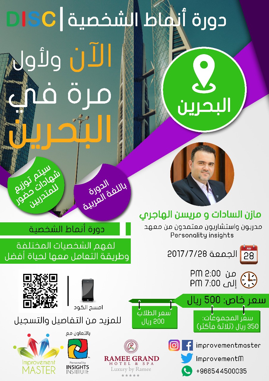 تنطلق في مملكة البحرين غدا الجمعة الدورة التدريبية المتخصصة التي تحمل عنوان “أنماط الشخصية لحياة أفضل” حيث تعطي الدورة تفصيلا يساعد على فهم أنواع الشخصيات المختلفة وطريقة التعامل معها